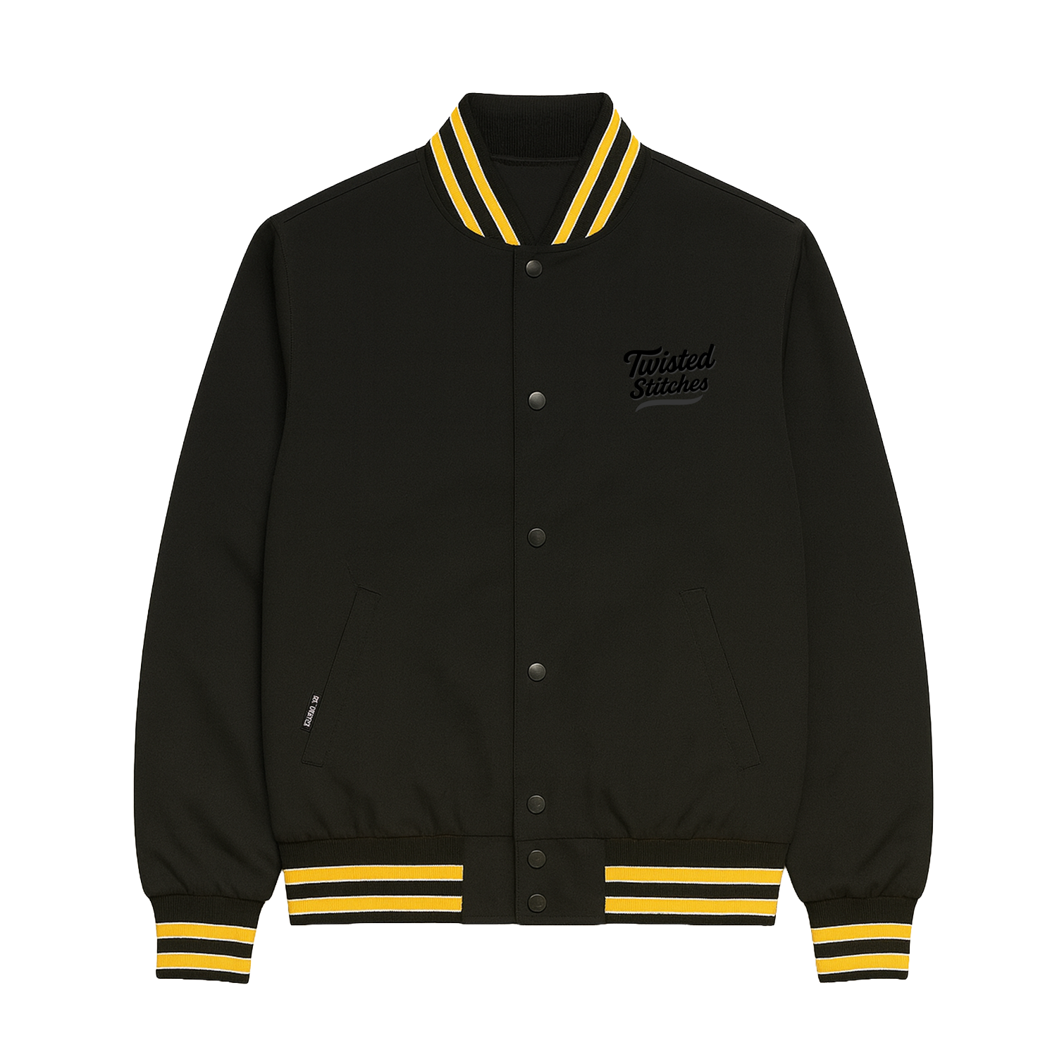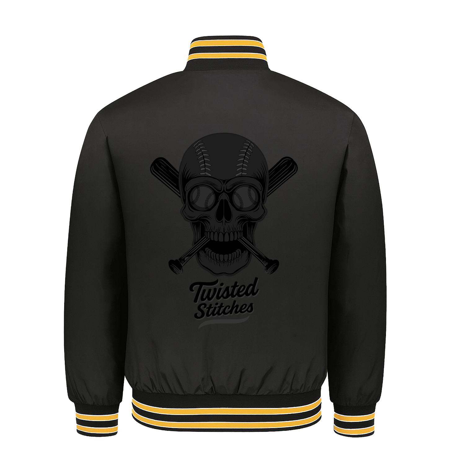 The blackout bomber doesn’t walk into a room—it takes the plate. Matte-black skull, crossed bats, and stealth stitching turn the back panel into a statement piece that hits harder than a no-doubt homer. It’s clean, cocky, and built with that “don’t test me” energy only a true varsity silhouette can pull off.